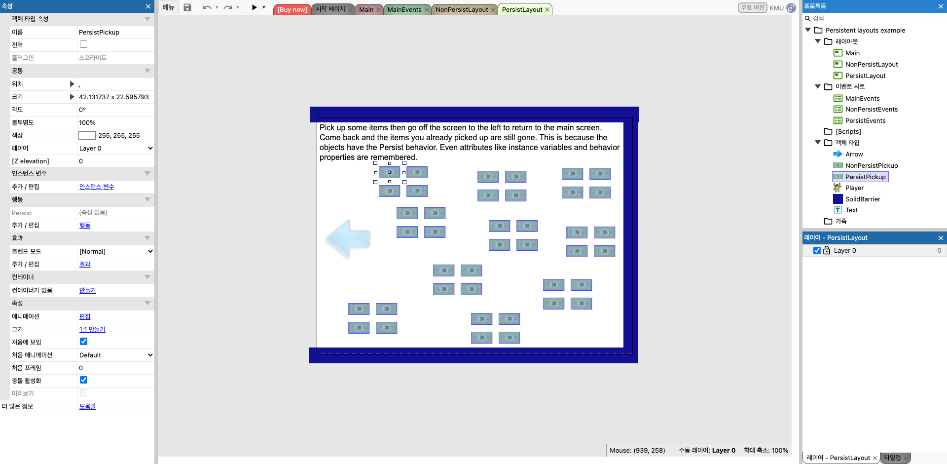 모든 객체, 인스턴스 변수, 글로벌 및 로컬 변수, 동작 속성, 효과, 입자, 현재 재생 중인 오디오 등 프로젝트의 모든 상태를 로컬 저장소에 저장한다. (예외는 아래 링크에서 확인) 심지어 슬롯도 지원한다. 이래도 되나 싶을 정도로 단순하고 강력한 상태 저장 기능이다.