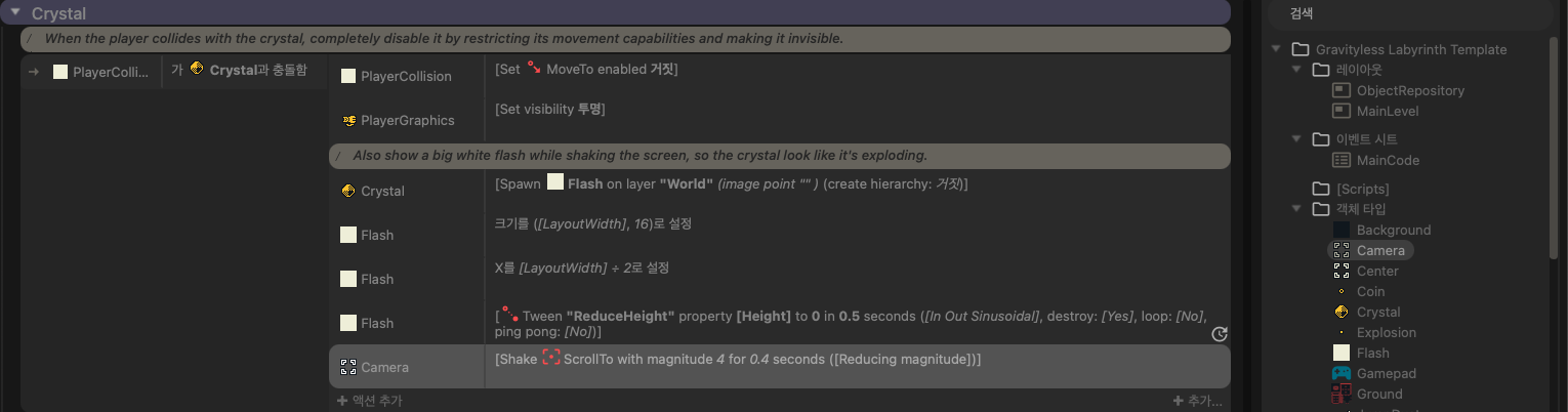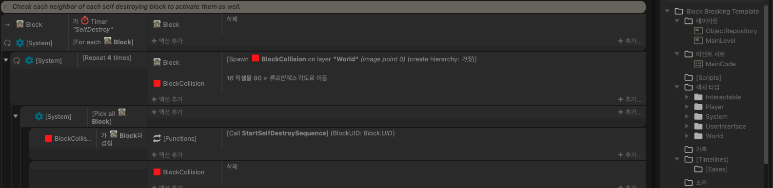 위 이미지처럼 이 기능을 사용하기 위해서는 충돌 여부가 아닌, 'Bullet' 행동의 Step에서 충돌체와 겹쳤는지 확인해야 한다. (이 때 이벤트는 상위 조건에 상속받기 때문에 충돌 여부는 조건에 없다. 어차피 Stepping이 충돌 검사 역할임.)
