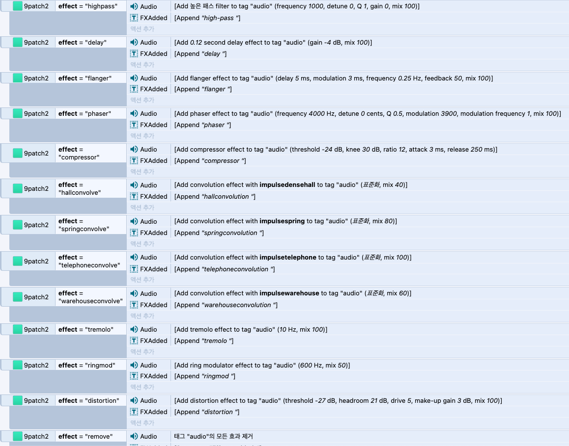 몇 개 생략됐지만 지원하는 대부분의 오디오 효과. 파라미터를 보면 의외로 고급 제어가 가능하다.