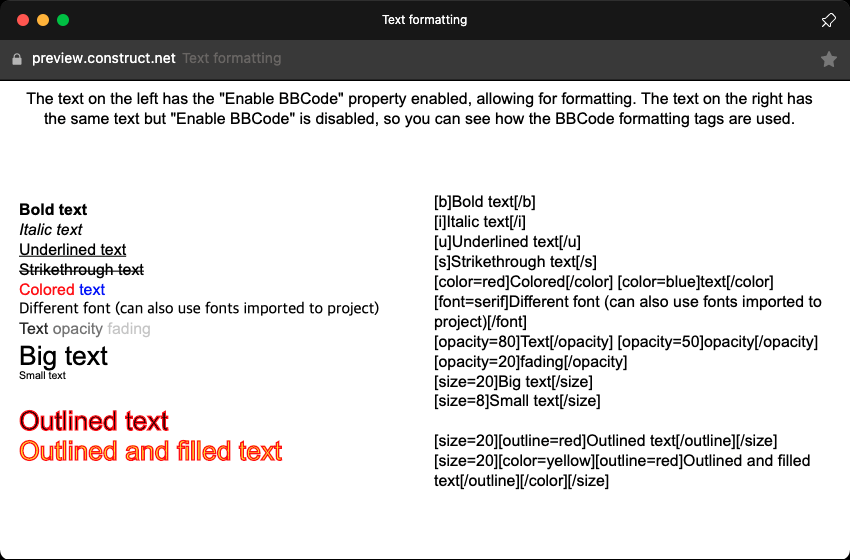 (예제) SpriteFont formatting : BBCode를 활성화해서 사용할 수 있다. 일반 텍스트와 다른 점을 유의.
