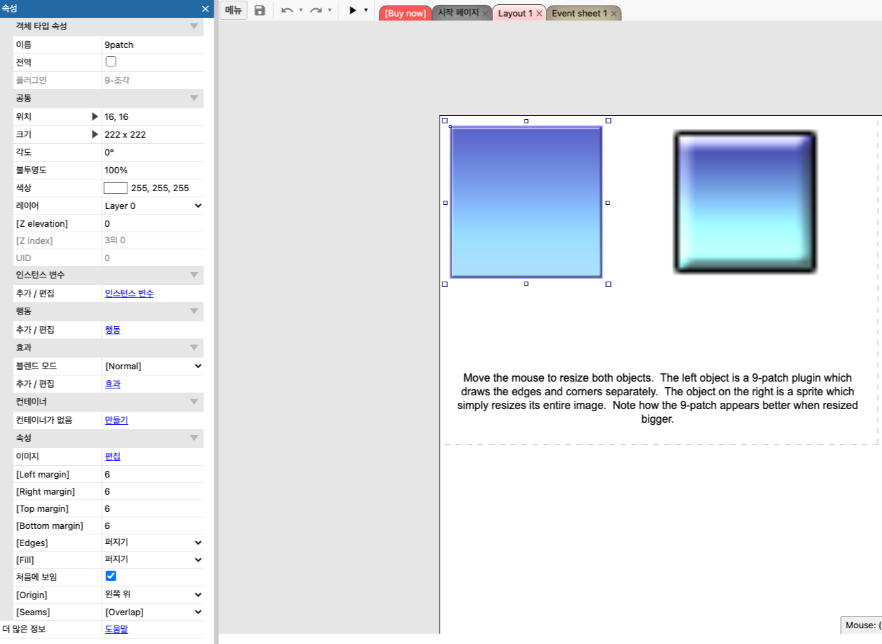 이미지의 길이나 크기를 변경해도 본래의 모습을 유지하는 기능. 주로 말풍선 효과에 쓰인다. 왼쪽 밑 객체의 속성에 주목.