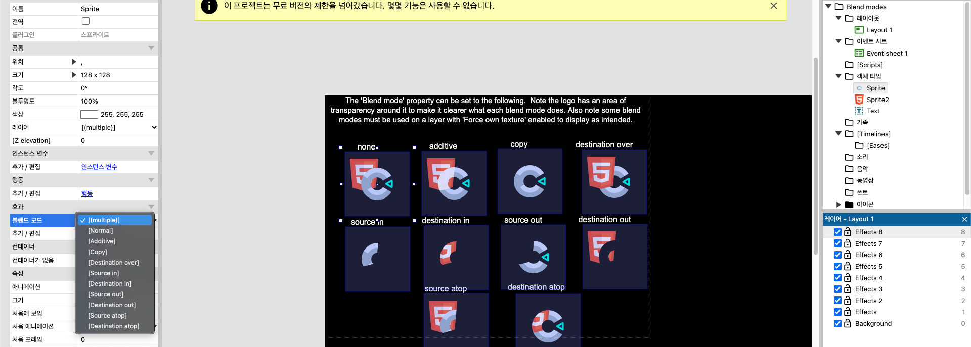 특히 'destination out' 모드를 이용하면 이렇게 부분 조명 효과를 만들 수 있다. 이 때 조명 이미지가 있는 레이어는 불투명의 검은 색이어야 하고, 'Force own texture'을 활성화해야 한다.