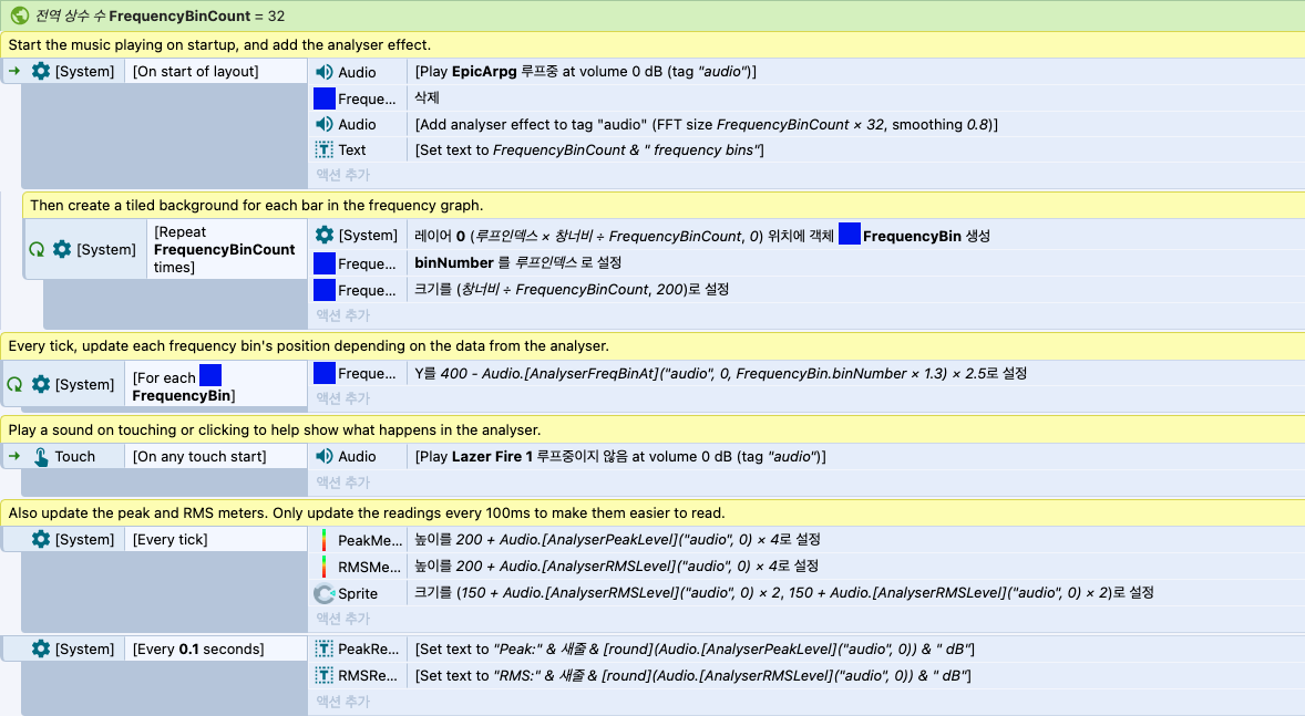 FFT를 대강 이해했다. 이것으로 주파수 응답 그래프를 그릴 수 있고, 역시 오디오 스펙트럼(비주얼라이제이션)을 구현할 수 있다. 위 이미지의 해당 코드는 내가 최대한 보기 좋게 기존 코드에서 값을 조절한 결과이다.