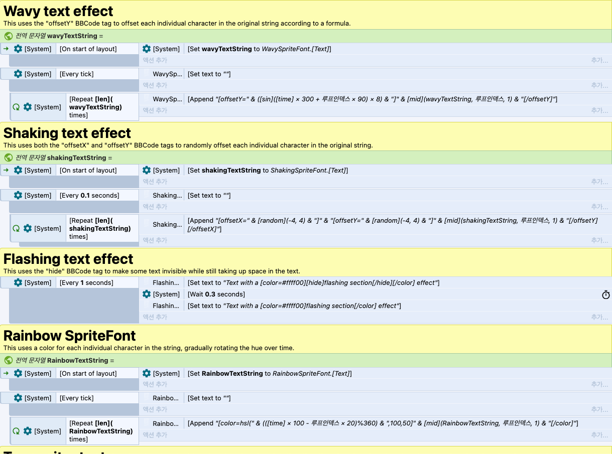 (예제) Animated text effects : 레인보우 기능이 빠져 있어서 굳이 캡쳐 안 함. Wavy 효과에 BBCode를 적용하면 마치 BBCode를 비활성화한 것처럼 출력됨. 결과가 서로 다르네?
