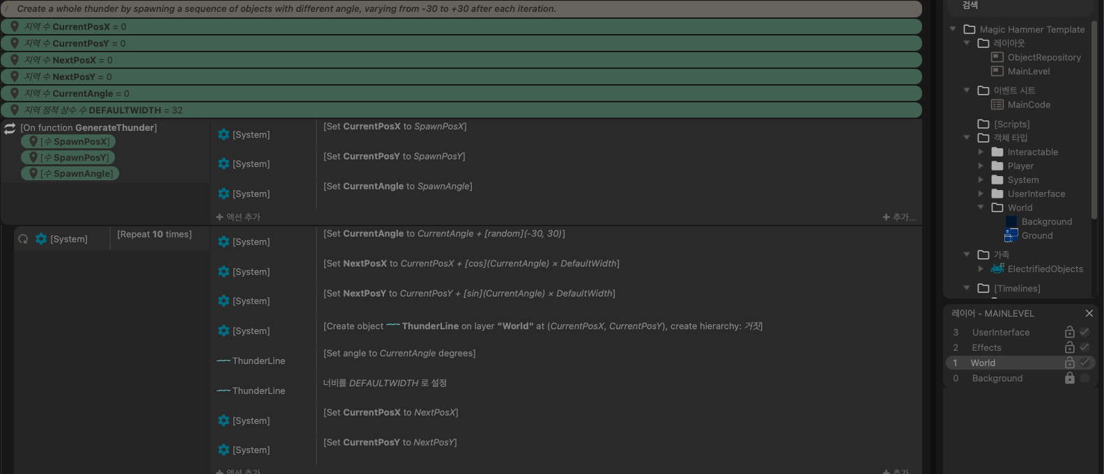 이번에도 삼각함수로 거리를 계산한다. 그 거리마다 각도도 조금씩 바꾸며 번개를 표현하는 선을 생성해서 이어준다.