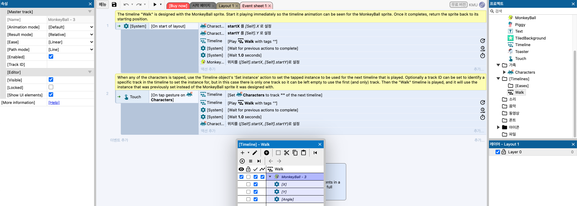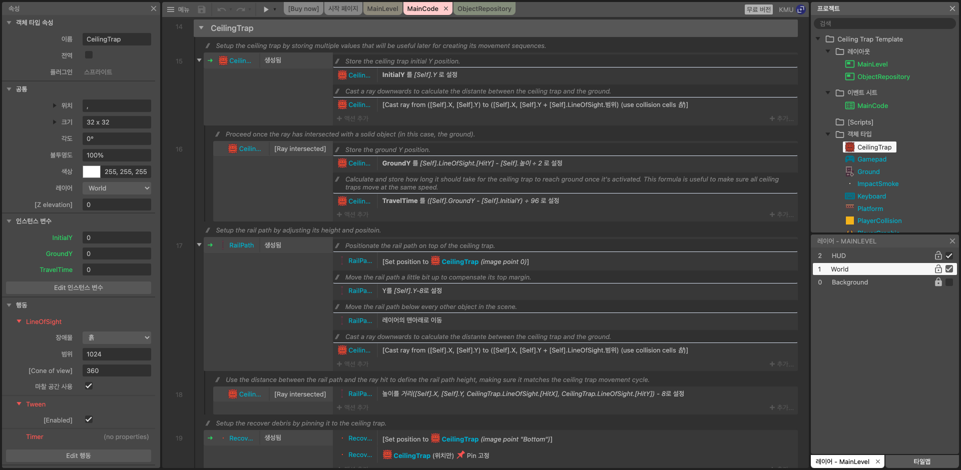 이 와중에 'Every X Seconds' 이벤트에 대해 살펴보았다. 0.1초를 1초로 바꾸어 시도해보았더니, 스페이스를 꾹 누르지 않고 연타해도 1초마다 액션이 실행된다! 그 말은 즉, 같은 이벤트는 이전 이벤트가 종료되어야 실행할 수 있다. 와우 편리하군.